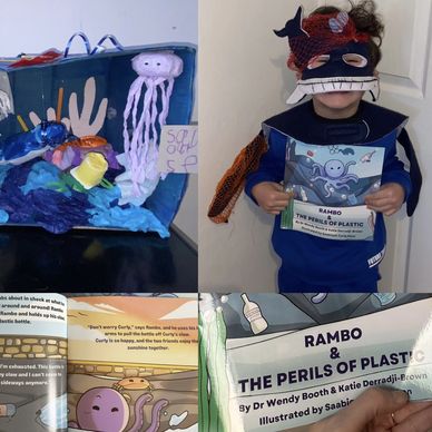 Extremely pleased that Rambo and the Perils of Plastic was chosen for a Cardiff school's art project, and by pupils for World Book Day. Wonderful creativity, and fantastic to see Rambo 'come to life!".
